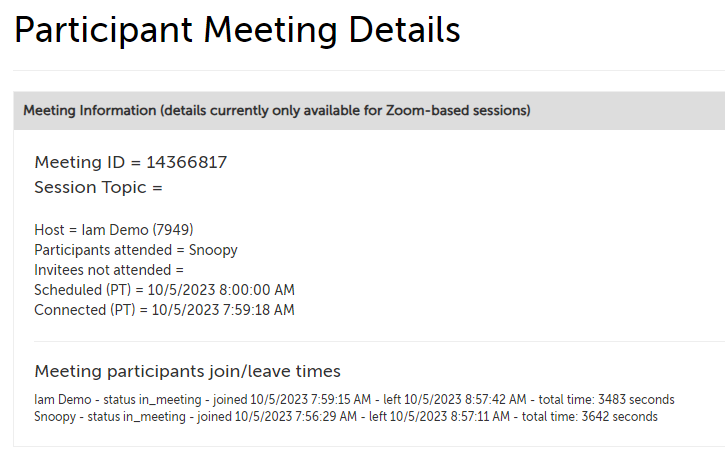 • Scheduled: the date/time the session was scheduled for. This will display in the logged-in user's time zone.